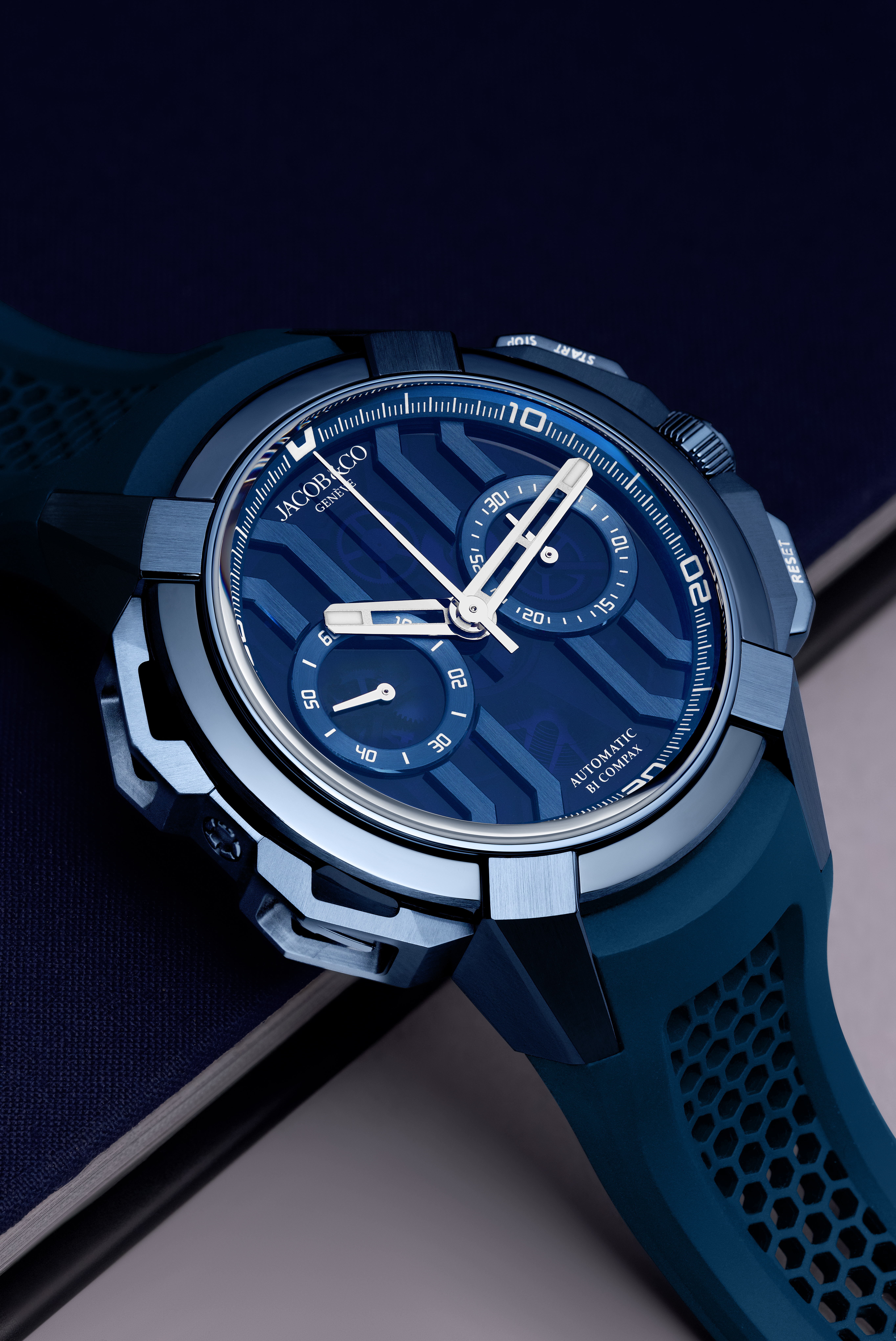Inside beats the Swiss automatic movement Jacob & Co. JCAA05, offering a 48-hour power reserve. With water resistance up to 200 meters, these timepieces are ready to perform even in demanding conditions. A blue rubber strap with a titanium buckle completes the modern and athletic aesthetic.
