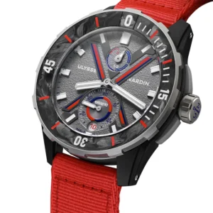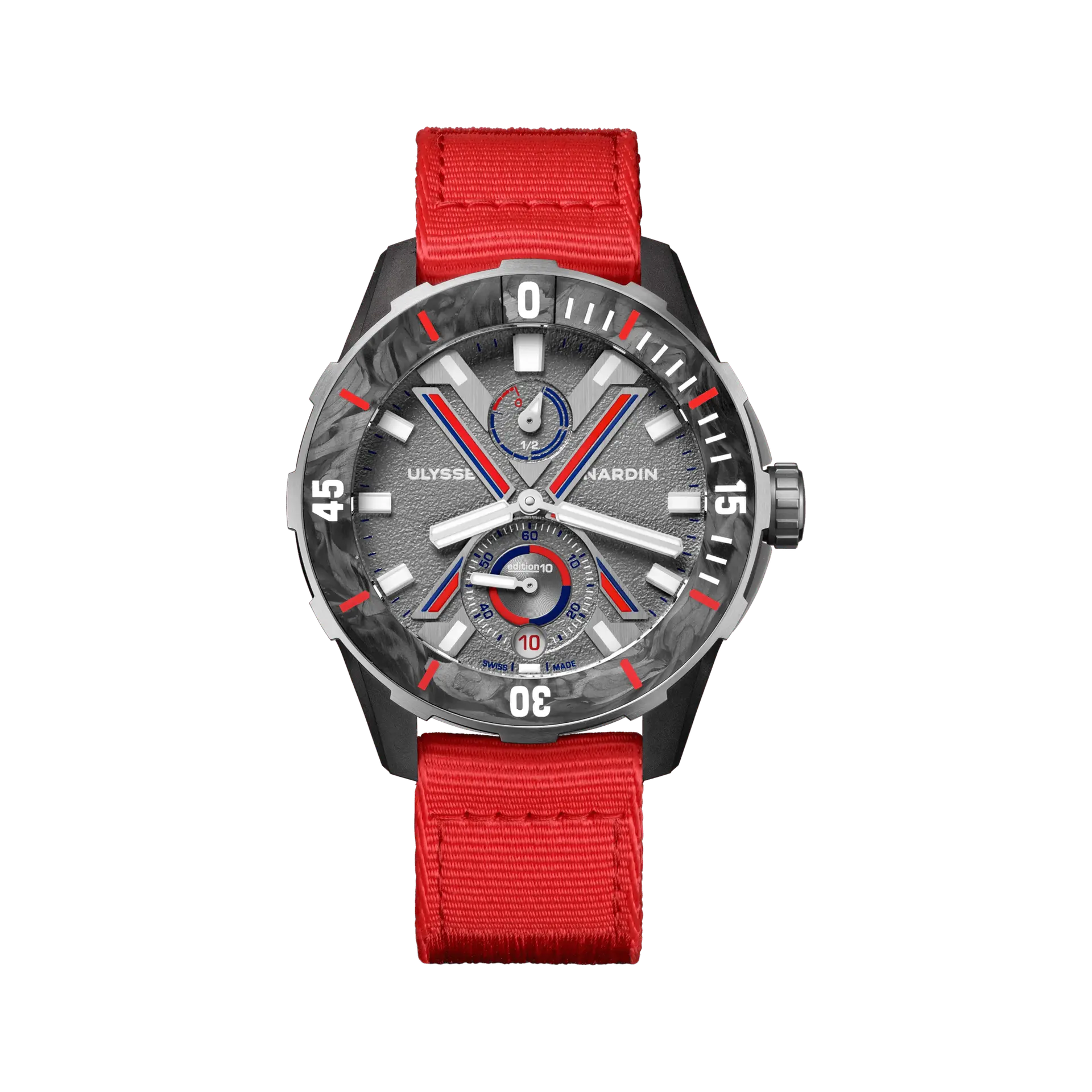 The 44 mm case is crafted from innovative recycled materials, including steel, carbon fibers, and polyamide made from recycled fishing nets. The result is a lightweight yet extremely durable case with water resistance up to 300 meters.